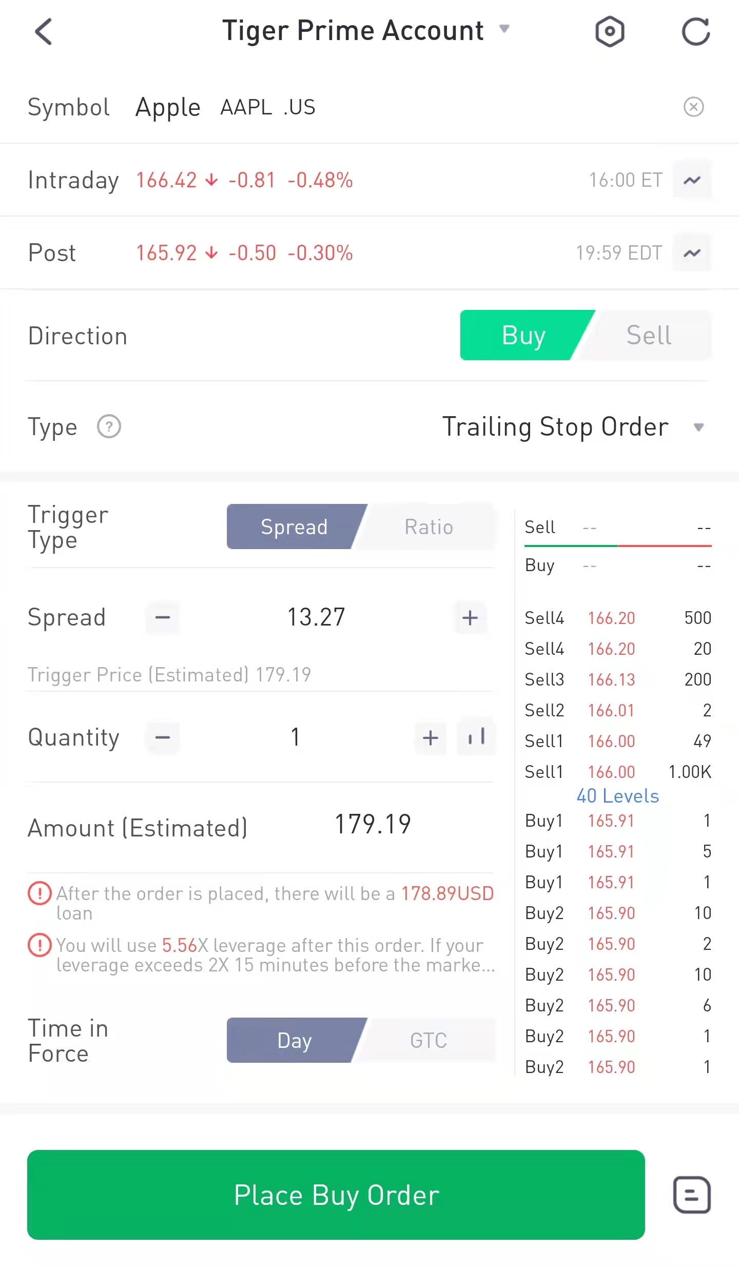Select Trailing Stop Loss Order in Tiger Trade App, we will find that there is no price, only spread and percentage options. What does it mean?
