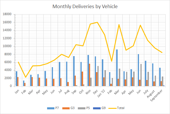 Deliveries have consistently slid since peaking above 15,000 in June for the third time this year. Weakness was evident in all three models, with volume in the P7 sliding over 42% to 4,634 units from June's 8,045. G3i deliveries dropped by about one-third, while the P5 lost nearly 60%, falling from nearly 5,600 units to over 2,400 in just three months. The P5's weakness is particularly concerning, given how management was touting high levels of demand prior to the model's launch last year.