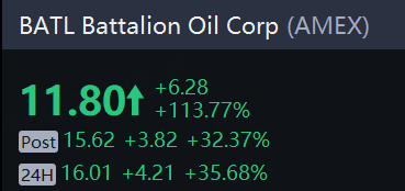 Battalion Oil Corporation shot up 35.68% to $16 in overnight trading after a 114% rally in prior trading session with traders snapping up smaller energy plays after crude spiked on fresh escalation in the Iran conflict.
