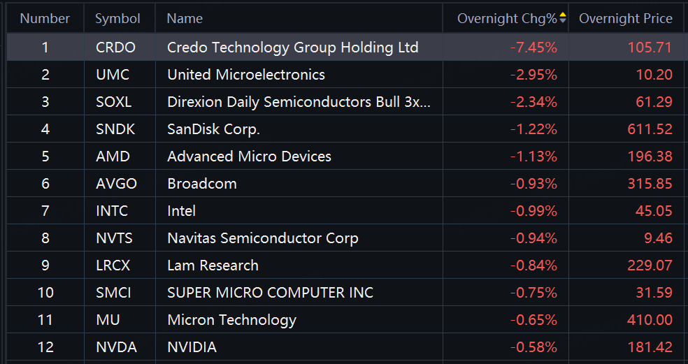 Chip stocks slid in overnight trading. Credo down over 7%; UMC down about 3%; SOXL down over 2%; SanDisk, AMD, Broadcom, Intel down around 1%.