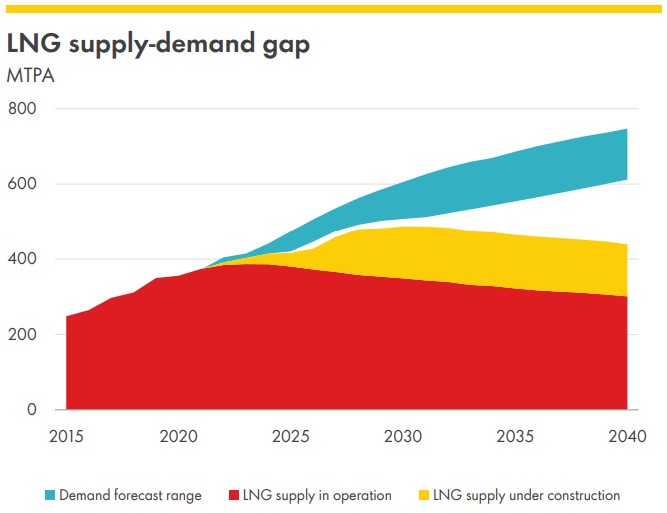 壳牌对液化天然气看法的核心是,该公司预计到2040年,天然气需求将增长近一倍。按照2021年约3.8亿吨/年的数据来看,市场预计在未来二十年天然气需求将增长至7亿吨/年。与此同时,壳牌表示在未来二十年内,该公司天然气供应量约为500吨/年,市场将在本世纪中期出现历史性的供应不足。