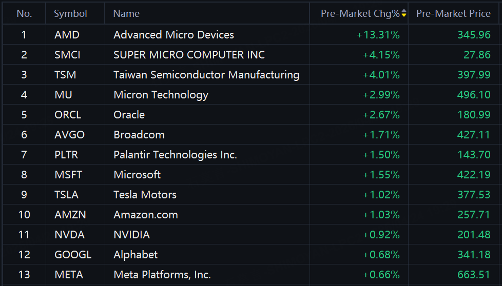 Big tech stocks continued to rally on Friday. AMD up over 13%; SMCI, TSMC up over 4%; Micron up 3%; Oracle up over 2%; Broadcom, Palantir, Microsoft up over 1%.