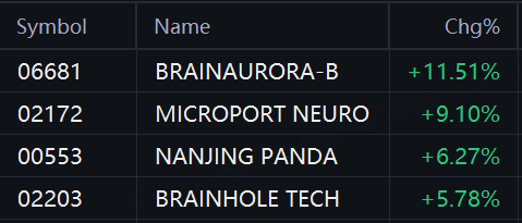 Brain–computer interface stocks jumped in Hong Kong. BrainAurora Medical rose 12%; MicroPort NeuroScientific rose 9%; Nanjing Panda Electronics and Brainhole Technology rose 6%.