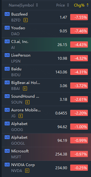 ChatGPT stocks turned red after Powell's speech; Buzzfeed and Youdao fell over 7%.