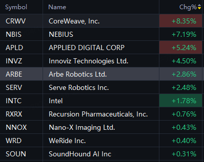 CoreWeave up 8%; Nebius up 7%; APLD, Innoviz up 5%; Arbe Robotics up 3%; Serve Robotics up 2%; RXRX up 1%.