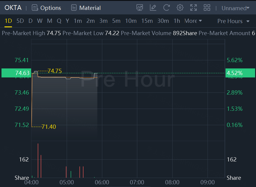 Okta shares gained 4.5% to $74.63 in premarket trading Monday after shares of the identity-management software provider were upgraded to Buy from Sell at Goldman Sachs and the price target was raised to $91 from $77, the Fly reported.