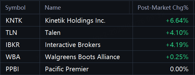 Kinetik shares jumped 6.6% in extended trading, Interactive Brokers and Talen gained more than 4%, Walgreens rose 0.3%.