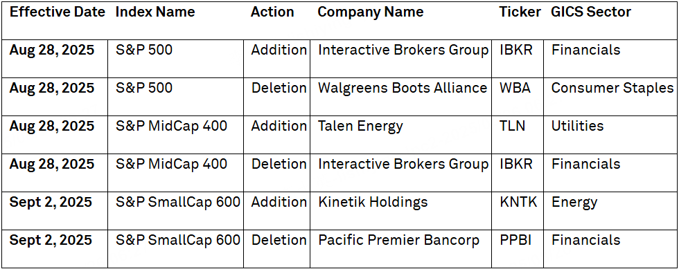 S&P MidCap 400 constituent Interactive Brokers Group Inc. (NASD: IBKR) will replace Walgreens Boots Alliance Inc. (NASD: WBA) in the S&P 500, and Talen Energy Corp. (NASD: TLN) will replace Interactive Brokers Group in the S&P MidCap 400 effective prior to the opening of trading on Thursday, August 28. Sycamore Partners is acquiring Walgreens Boots Alliance in a deal expected to be completed soon, pending final closing conditions.
