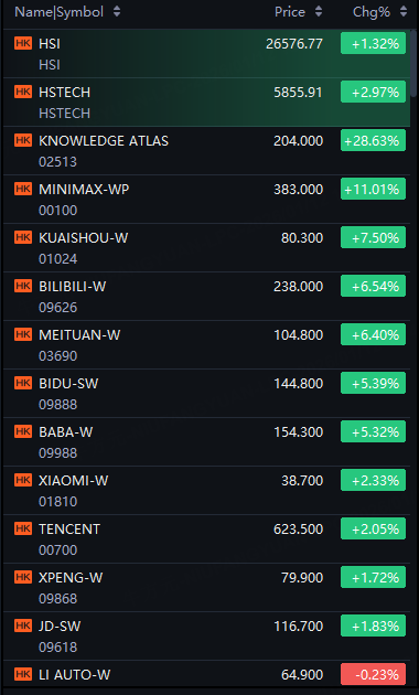 In terms of star stocks, Knowledge Atlas rose 29%; Kuaishou up 8%; Bilibili up 7%; Meituan rose 6%; Alibaba, Baidu rose 5%; Tencent, Xiaomi, XPeng rose 2%.