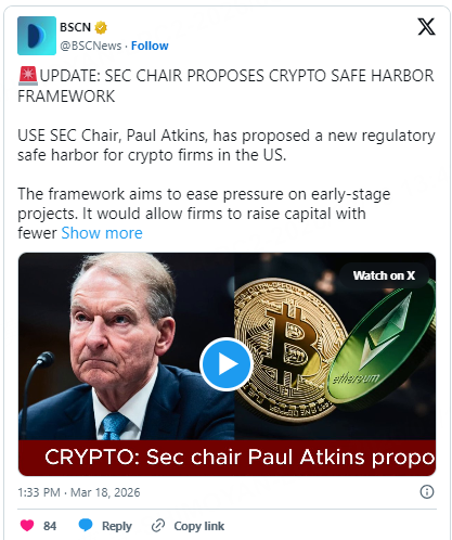 Chair Paul Atkins floated a safe harbor exemption on March 18 that lets crypto projects operate without immediate securities registration. It is a direct reversal of the regulation by enforcement era that suffocated US-based development for years.