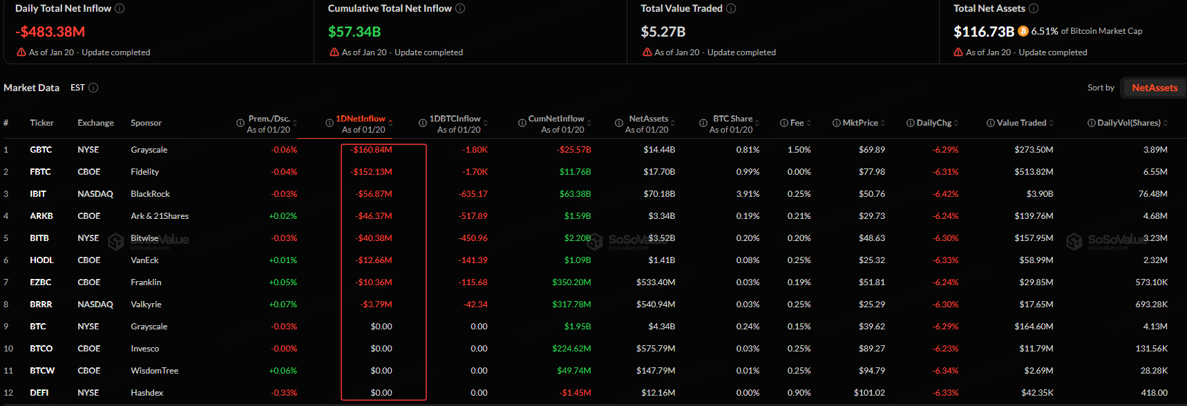 The Bitcoin spot ETF with the highest net outflow on Jan. 20 was Grayscale Bitcoin Trust , with a net outflow of $160.84 million.