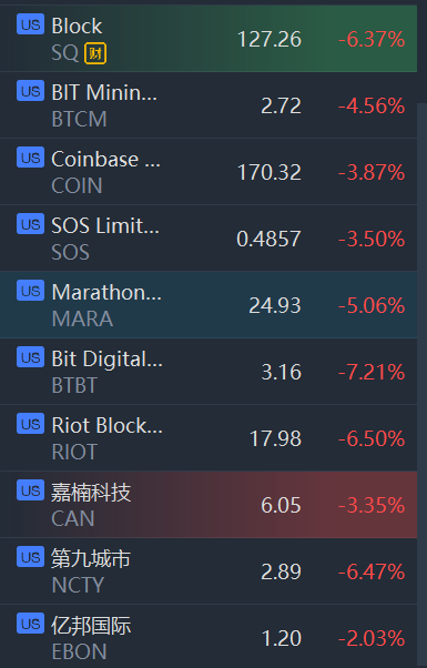 4月6日,美股区块链概念股集体走低,Bit Digital跌超7%,Riot Blockchain跌超6%,Marathon Digital跌超5%,SOS Limited、Coinbase跌超3%。