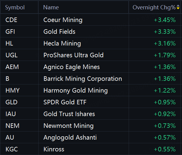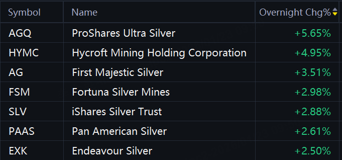 Silver, gold ETFs and stocks gained in overnight trading. ProShares Ultra Silver rose 6%; Hycroft Mining rose 5%; First Majestic Silver and Coeur Mining rose 4%; Gold Fields, Hecla Mining, Fortuna Silver Mines, iShares Silver Trust, Pan American Silver, and Endeavour Silver rose 3%; ProShares Ultra Gold rose 2%.