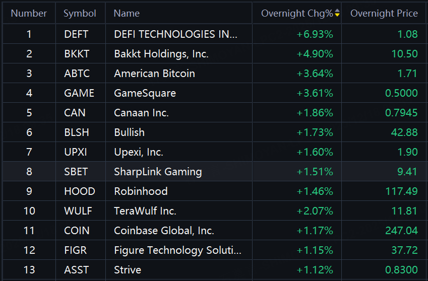 Crypto shares rebounded in overnight trading. DeFi Tech up 7%; Bakkt Holdings up 5%; American Bitcoin, GameSquare up over 3%.