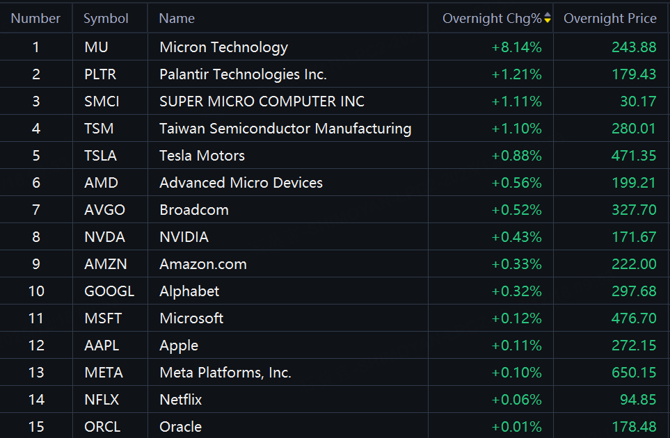 Big tech stocks rebounded in overnight trading. Micron up 8%; TSMC, Palantir, Tesla, SMCI up around 1%.