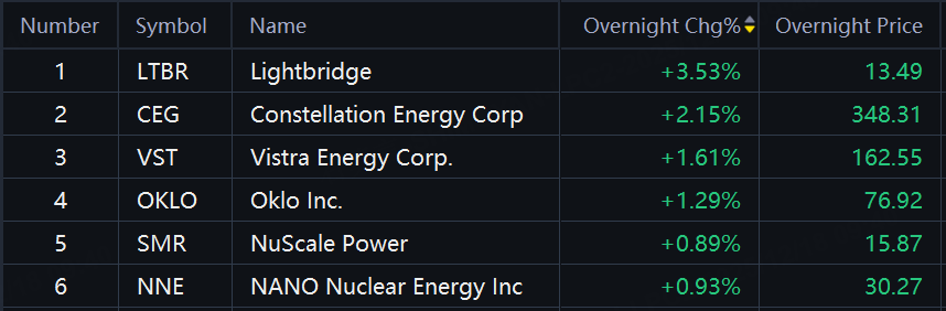Nuclear shares gained in overnight trading with Lightbridge up over 3%; Constellation Energy up over 2%; Vistra Energy, Oklo up over 1%.