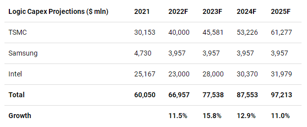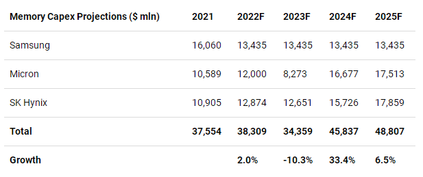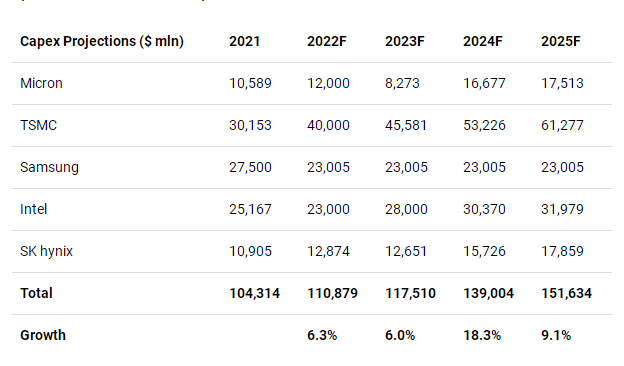 As seen in the table, we projected the overall total capex for Micron, TSMC, Samsung, Intel, and SK hynix to grow by 2.5% in 2022 and slow down to 1.5% in 2023 before recovering in 2024 at 13.3%.