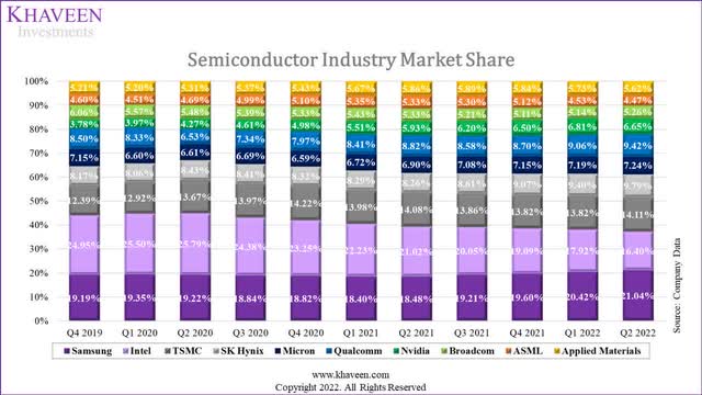 We compiled the top 10 semiconductor companies based on their TTM revenues in the market share chart above. In Q2 2022, Samsung (OTCPK:SSNLF) held its lead in the semiconductor industry as the market leader with a 21% market share followed by Intel (INTC) which maintained its place despite losing some share while TSMC (TSM) continued to catch up with Intel as it gained share. Besides Intel, which was the only logic chipmaker to lose market share among the top 10, the two equipment makers also lost market share during the quarter.