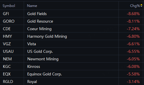 Gold Fields fell 9%; Gold Resources fell 8%; Coeur Mining, Harmony Gold, U.S. Gold fell 7%; Newmont, Kinross fell 6%.