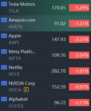 The Nasdaq index fell more than 1% in morning trading. Big tech stocks dropped with Tesla down 5%, Amazon down 3%, Apple and Meta Platforms down 2%.