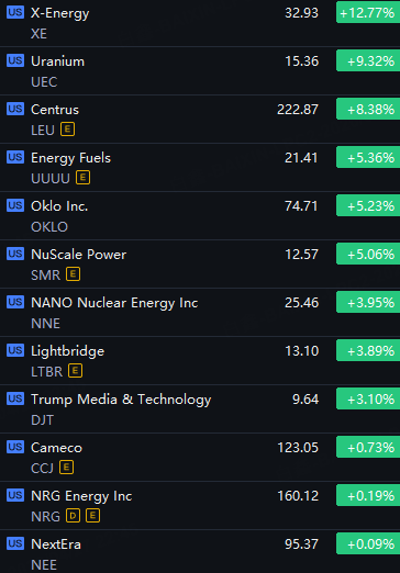 Nuclear Energy Stocks Rally. X-Energy up 13%; Uranium up 9%; Centrus up 8%; Energy Fuels, Oklo and NuScale Power up 5%.