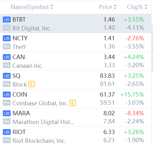 Bit Digital slid over 4%; Coinbase, Canaan, The9 fell over 3%; Marathon Digital, Block fell over 2%.