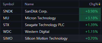SanDisk up 9%; Micron up 3%; Western Digital, Seagate up 1%.