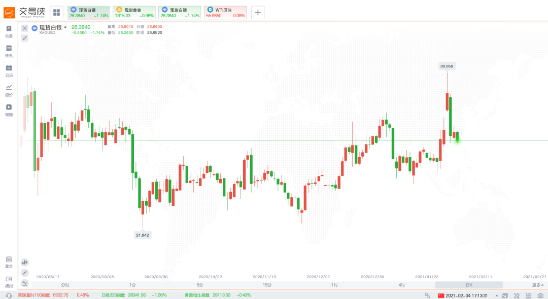 2月1日欧盘时段,大战来到高潮,现货白银暴涨10%,一举上破30美元大关,刷新2013年2月以来的新高。