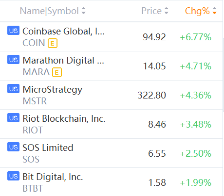 Coinbase, MicroStrategy, Marathon Digital, Bit Digital, and Riot Blockchain rose between 1% and 7%.