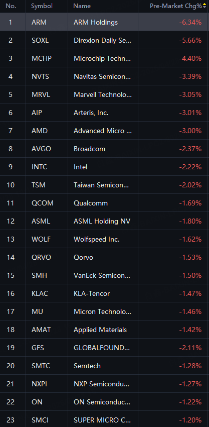 Chip Stocks Kept Dropping in Premarket. ARM and SOXL Fell 6%; Microchip down 4%; Navitas, Marvell, Arteris And AMD Fell 3%; Broadcom, Intel, TSMC, ASML and Qualcomm Down 2%.