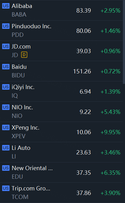 Hot Chinese ADRs jumped in morning trading. Alibaba rose 3%; NIO rose 5%; XPeng rose 10%; New Oriental Education rose 6%.