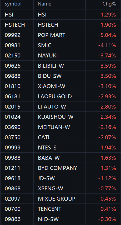 In terms of star stocks, Pop Mart fell 5%; SMIC, Nayuki, Bilibili, and Baidu fell 4%; Xiaomi, Laopu Gold, and Li Auto fell 3%; Kuaishou, Meituan, CATL, NetEase, and Alibaba fell 2%; BYD and JD.com fell 1%; Tencent fell 0.4%.