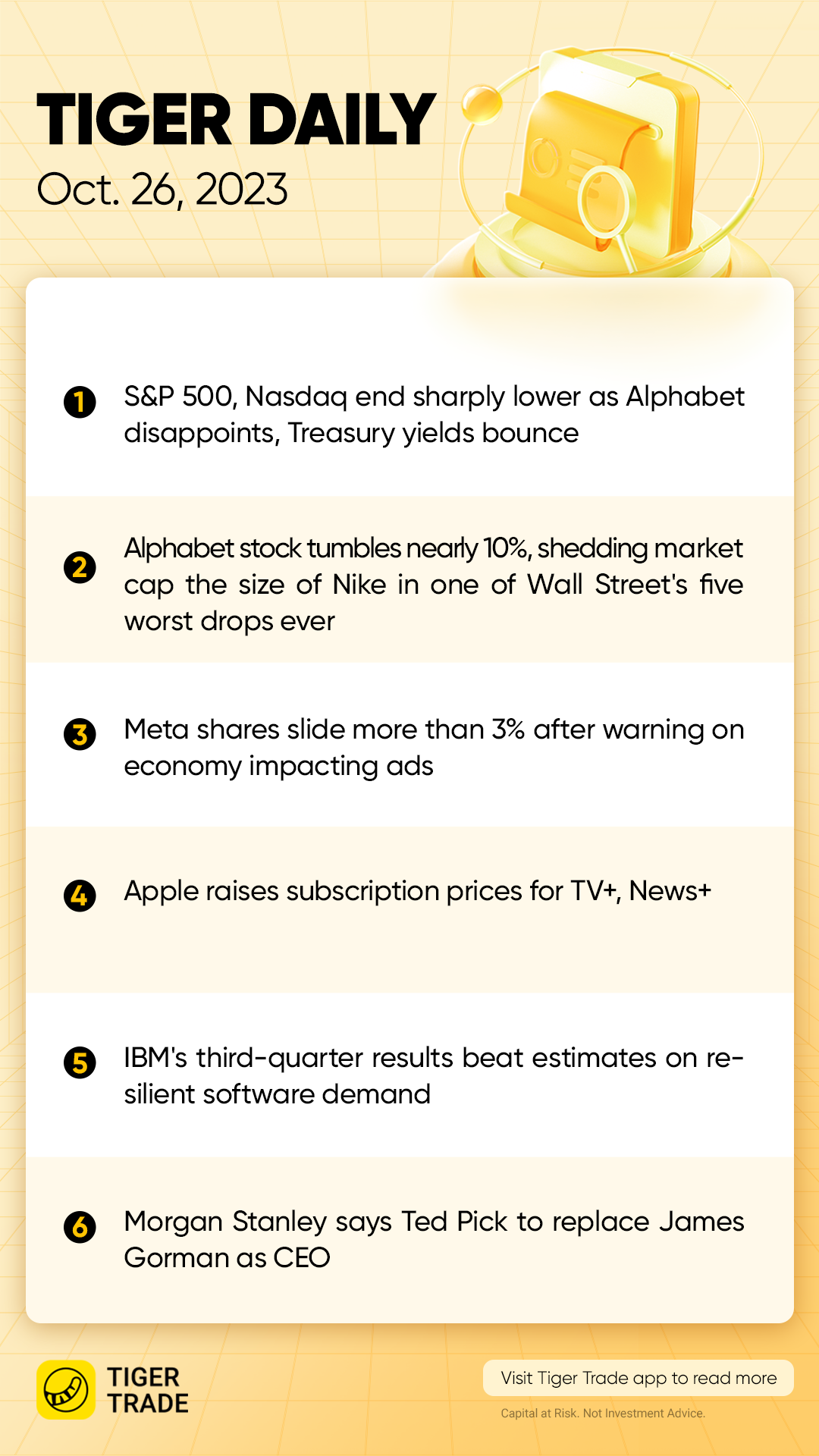 U.S. stocks tumbled in a broad sell-off on Wednesday as Alphabet shares slid after the Google parent posted disappointing earnings and as U.S. Treasury yields rose, reviving fears that interest rates could stay higher for longer.