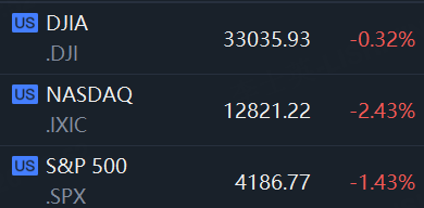 The Dow fell 105.45 points, or 0.32%, to 33,035.93, the S&P 500 lost 60.91 points, or 1.43%, to 4,186.77 and the Nasdaq Composite dropped 318.65 points, or 2.43%, to 12,821.22.