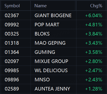 New consumption stocks gained in Hong Kong. Giant Biogene rose 6%; Pop Mart rose 5%; Bloks and Guming rose 4%; Mao Geping, Mixue Group, WL Delicious rose 3%; MNSO rose 2%; Auntea Jenny rose 1%.