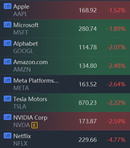 Big tech stocks dropped in morning trading. Apple, Microsoft, Alphabet, Amazon, Meta Platforms, Netflix, Tesla and Nvidia fell between 1% and 5%.