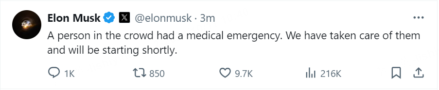 Tesla CEO Elon Musk on X said the Robotaxi Event, which was scheduled to start at 10 p.m. Eastern time tonight, is delayed because a person in attendance had "a medical emergency."