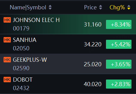 Robotic stocks jumped in Hong Kong. Johnson Elec up over 8%; Sanhua up over 5%; Dobot, Geekplus up around 3%.