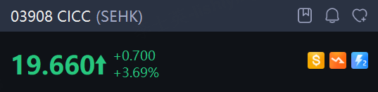 CICC (03908) gained 3.7% during Thursday's intraday session, reflecting strong investor optimism following the announcement of its merger plan with Dongxing Securities and Cinda Securities. The stock's sharp rise underscores market confidence in the deal's potential to transform CICC into a financial giant.