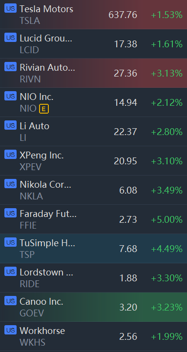 EV stocks rebounded in morning trading. Tesla, Lucid, Rivian, Nio, Xpeng Motors, Li Auto, Nikola and Faraday Future climbed between 1% and 5%.