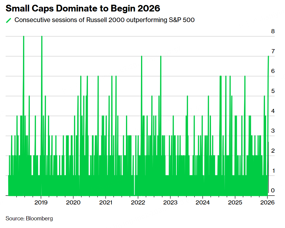 The Russell 2000 Index, which hit a record high on Monday, has now beaten the S&P 500 for seven consecutive trading sessions. The last time small caps achieved a longer run was in January 2019, when equities were rebounding sharply after a selloff that had pushed the market close to bear-market territory.