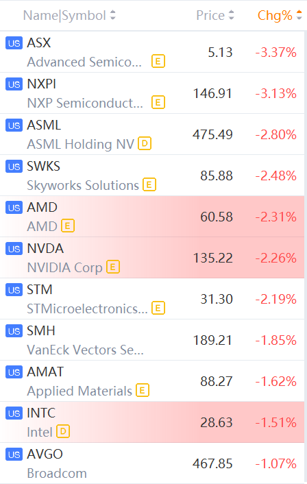 Semiconductor stocks fell in morning trading. ASX, NXPI slid more than 3%; Nvidia, AMD, ASML fell over 2%.