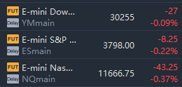 At 7:50 a.m. ET, Dow e-minis were down 27 points, or 0.09%, S&P 500 e-minis were down 8.25 points, or 0.22%, and Nasdaq 100 e-minis were down 43.25 points, or 0.37%.
