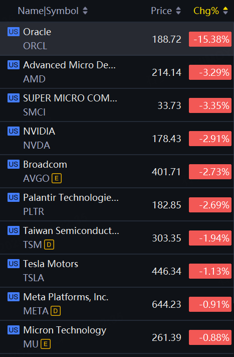 Oracle tumbles 15%; Nvidia, AMD, SMCI down about 3%; Broadcom, Palantir down over 2%; TSMC down 2%.