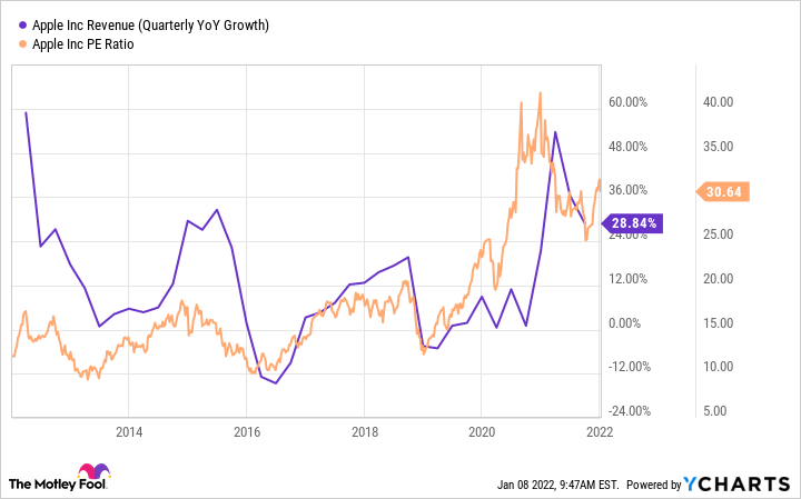 I think it's more likely that Apple steadily reverts to its past valuation, a P/E between 10 and 20, as revenue growth slows over the next 24 months. This isn't to say that Apple's not a great company, because it is. Unfortunately, being a great company doesn't guarantee that a stock is an excellent investment. Apple is a tech blue-chip that likely isn't going anywhere anytime soon. But if I'm looking to put new money to work in the market,there could be better places to look.