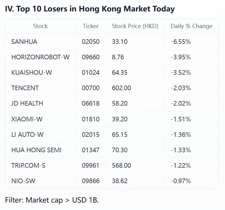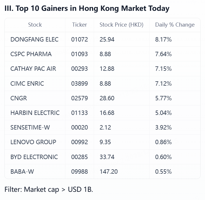 Outside tech, several notable movers stood out. Airlines rallied, led by Cathay Pacific (+7.15%), tracking sector strength and travel normalization. Industrials were firm: Dongfang Electric (+8.17%), Harbin Electric (+5.04%), and CIMC Enric (+7.12%) advanced on sustained demand and infrastructure themes. Healthcare outperformed, with CSPC Pharma (+7.64%) among the day’s leaders. Materials-linked CNGR (+5.77%) also gained, while Sanhua (-6.55%) weighed on components and industrial supply chain sentiment.