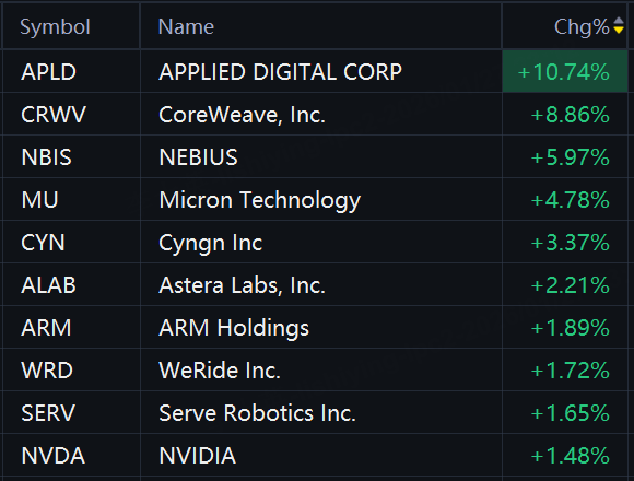 Nvidia-related stocks jumped in morning trading. Applied Digital rose 11%; CoreWeave rose 9%; Nebius rose 6%; Micron rose 5%; Cyngn rose 3%; Astera Labs, Arm, WeRide, Serve Robotics, and Nvidia rose 2%.