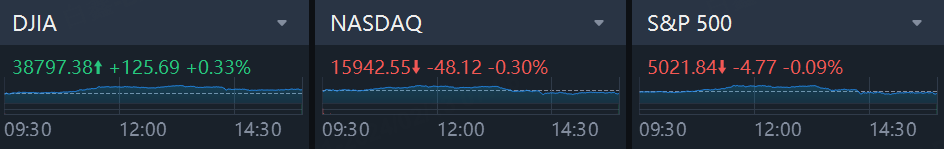The S&P 500 lost 4.77 points, or 0.09%, to end at 5,021.84 points, while the Nasdaq Composite lost 48.12 points, or 0.3%, to 15,942.55. The Dow Jones Industrial Average rose 125.69 points, or 0.33%, to 38,797.38.