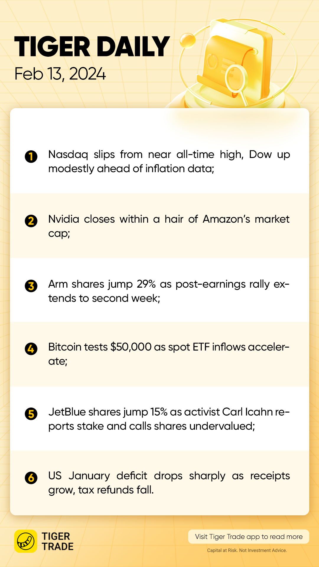 The Nasdaq slipped on Monday afternoon after briefly surpassing its record closing high from November 2021, while the Dow rose modestly ahead of two U.S. inflation reports this week that could influence Federal Reserve policy.