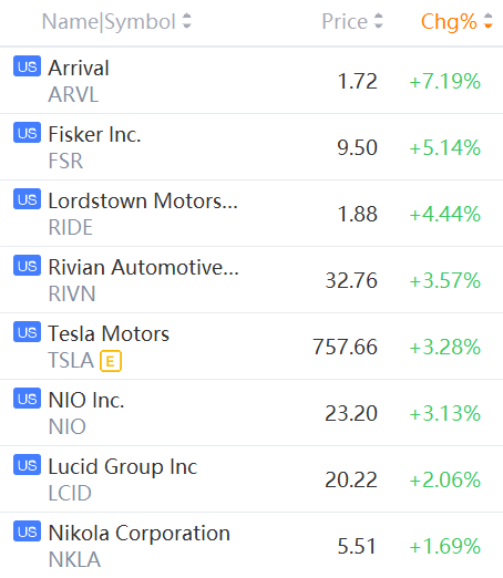 Tesla, Lucid, Rivian, Nio, Fisker, Arrival, Nikola, and Lordstown climbed between 1% and 7%.